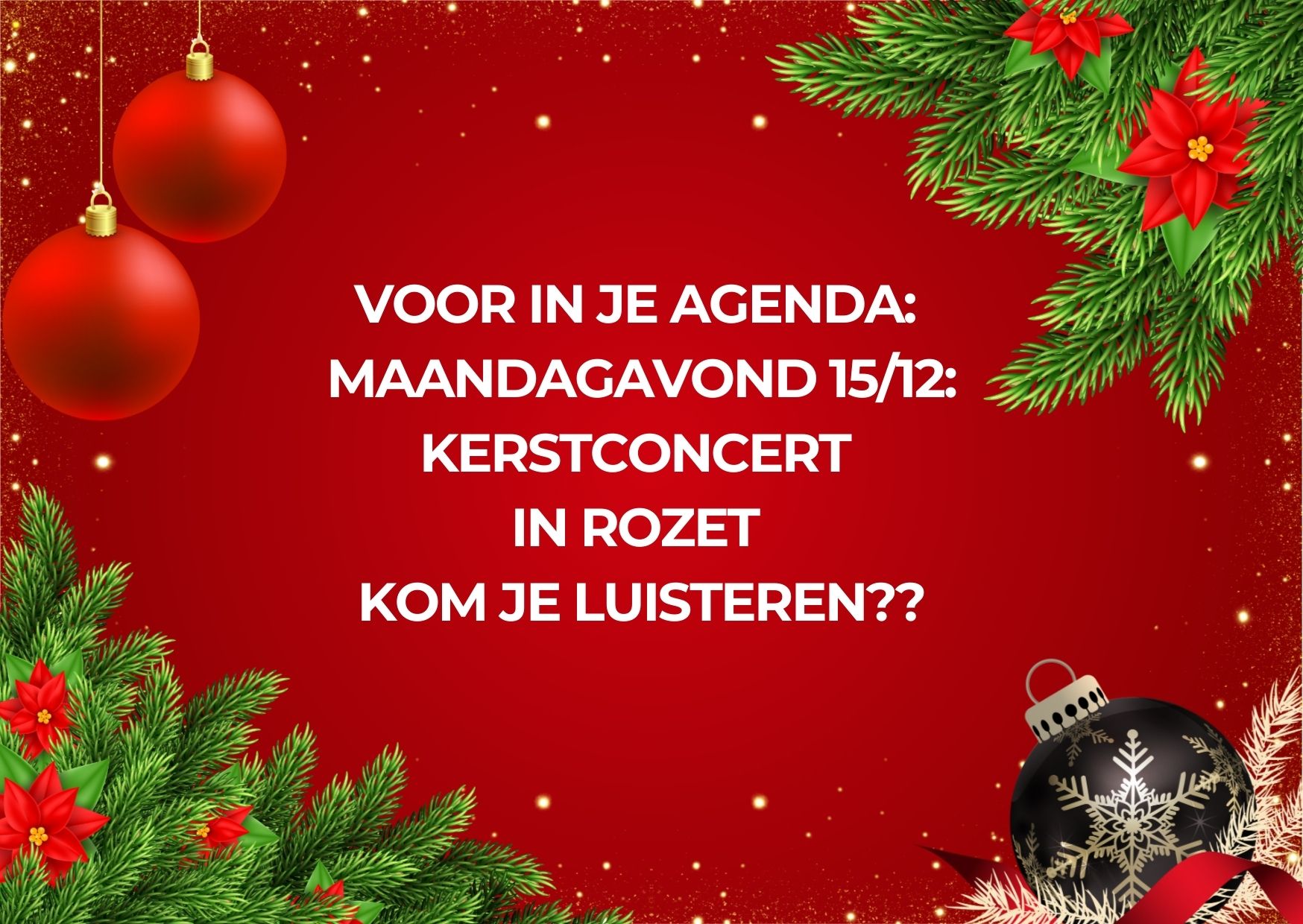 Ook zo’n zin in kerstliedjes? Op maandagavond 15 december vanaf 18.00 uur nodigen leerlingen en docenten van De Muziekmakerij je van harte uit voor een sprankelend kerstconcert in Rozet. Laat je betoveren door prachtige muziek, hartverwarmende samenzang en kerstgezelligheid. GRATIS ENTREE!
